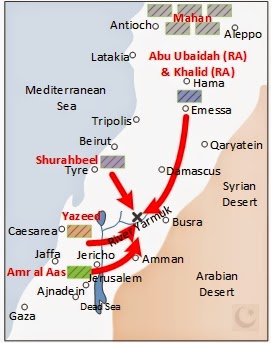 Byzantine Syria was a profoundly Christian area encompassing Jerusalem, Antioch and other major centres of the Christian faith. The Byzantine emperor Heraclius had spent a decade on a holy defensive war against the Persians. In 629 AD Heraclius rejected mad Muhammad’s demands to submit his kingdom to the Meccan Al Lah idol and prostate himself to Muhammad. Immediately raids started, led by Walid. At Ajnadayn in Israel the Muslims with Walid in the centre defeated a large 10.000-man Byzantine force. The Muslims turned toward Damascus defeating another Roman force south of the city in 635 AD allowing them to invest and conquer the city. Heraclius assembled an international force of Christians and mercenaries and by 636 AD was ready to take the offensive against the Muslim Jihad.